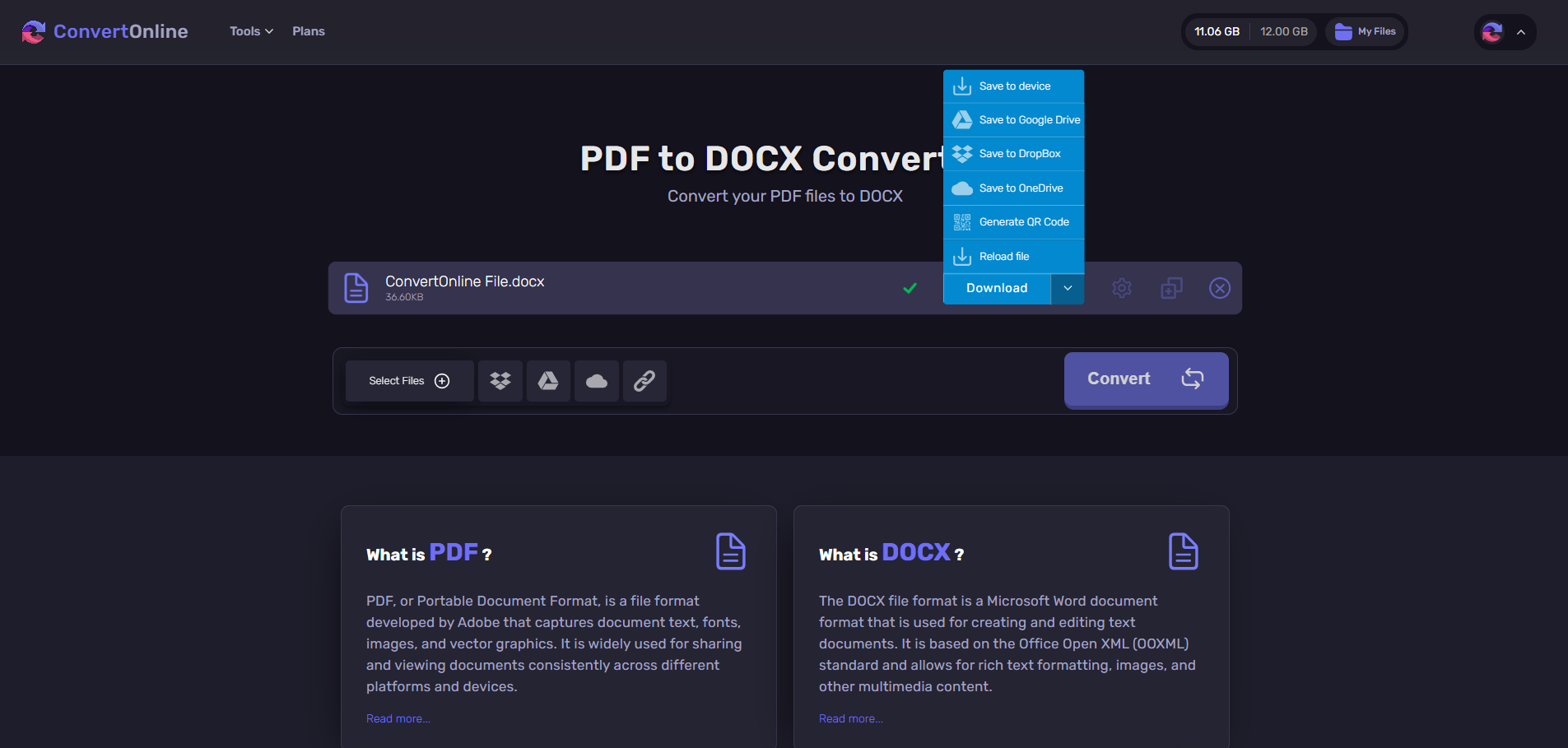 When the conversion is complete, a download button will appear. Click it to download your new DOCX file and open it in Microsoft Word, Google Docs, or any other editor of your choice. You can download your new DOCX file to your device, Google Drive, Dropbox, OneDrive, or generate a QR code for download.